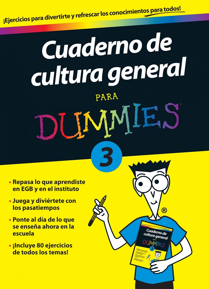 Mentes curiosas, padres que quieren ayudar a sus hijos con los deberes, gente de letras que quiere dar una segunda oportunidad a las ciencias, ingenieros con inquietud literaria, amantes de los retos, adictos a los concursos de la tele y aspirantes a maestros del Trivial, ¡bienvenidos a los Cuadernos de cultura general para Dummies!Con los divertidos ejercicios de este cuaderno recuperarás lo que aprendiste en la escuela y te pondrás al día en todas las asignaturas. ¡Pon a prueba tu memoria y presume de tus conocimientos delante de tus hijos!• Los temas “serios” — nunca aprendiste la historia, el lenguaje, el inglés, las ciencias o las matemáticas de una forma tan entretenida.• Actividades extraescolares — ¿eres un hacha en cine, televisión, deportes o toros? ¡Compruébalo!• Elige tu tema — cada asignatura está claramente identificada con un color, para que puedas encontrar lo que más te gusta.• “Es que soy de letras…” — ya no hay excusa, en cada ejercicio encontrarás una sencilla explicación para que comprendas claramente la solución.• Las bellas artes — si vas a por nota, busca los ejercicios de arte, literatura o música.• A cualquier hora y en cualquier lugar — en la playa o en la montaña, en invierno o en verano, en casa o mientras esperas el autobús, cualquier momento es bueno para hacer trabajar las neuronas.• Si quieres más — ¡Hazte con todos los cuadernos de la colección
