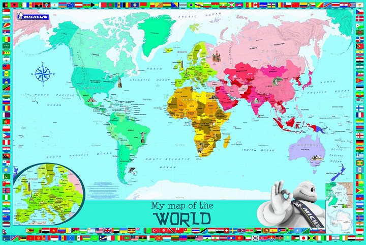 Incluye, además, una hoja de pegatinas con las banderas de los países actuales. Este mapa plastificado mide 91 x 61 cms.