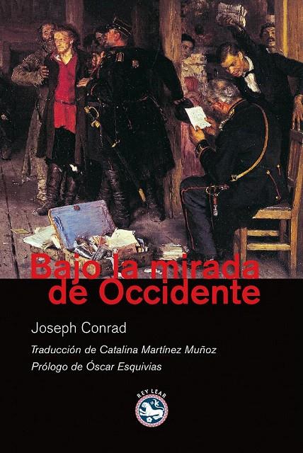 El estudiante ruso Razumov se ve envuelto en un atentado cometido por un compañero revolucionario al que acaba delatando a la policía. Empleando similar dureza contra la perversidad de las autoridades zaristas y la crueldad de los revolucionarios, Conrad reconstruye el drama psicológico del delator, que se agudiza aún más cuando éste es enviado a Ginebra para inflitrarse en la organización a la que pertenecía el activista traicionado. Su lucha interior para convivir con el remordimiento acaba convirtiéndose en una patología que afecta a su salud mental y física. Pero entre las múltiples lecturas posibles también está la del hombre desamparado, que no puede confiar en las despóticcs funcionarios rusos que le encargan la misión ni en los opositores en el exilio a los que se ve oblligado a traicionar. Narrada desde la perspectiva occidental de un inglés afincado en la capital suiza, Bajo la mirada de Occidente está a la altura de las grandes novelas de Conrad como Lord Jim, El agente secreto o El corazón de las tinieblas. Catalina Martínez Muñoz ha realizado una nueva traducción expresamente para esta edición de REY LEAR. Como dice en el prólogo el novelista Óscar Esquivias, «Bajo la mirada de Occidente es una de las obras mayores de Conrad. Quien no la conozca no debería demorar más su lectura».