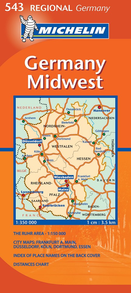 La edición actualizada del mapa Regional Germany Midwest, editado a escala 1/350 000, incorpora un cuadro de distancias, índice de localidades, un detalle a escala 1/150 000 de la región del Ruhr, así como los planos de las ciudades de Frankfurt, Düsseldorf, Köln, Dortmund y Essen.