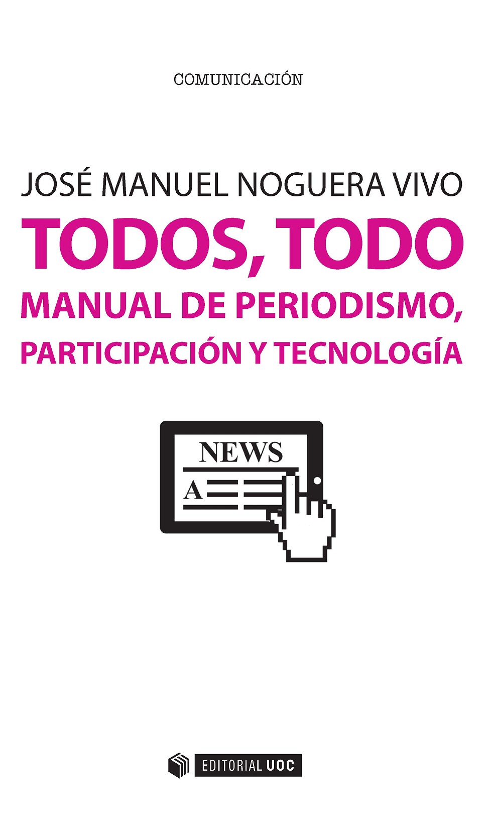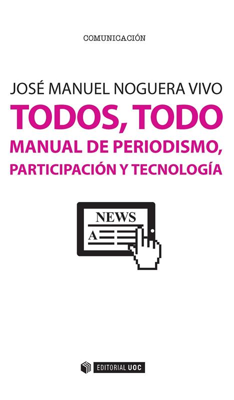 Consumimos noticias en las mismas plataformas sociales que nos avisan de los cumpleaños de nuestros amigos, que a su vez nos reenvían información interesante de medios que ni siquiera conocíamos. ¿Podíamos pensar que estas nuevas rutinas informativas no afectarían al periodismo? Todos, todo. Manual de periodismo, participación y tecnología esboza oportunidades para los futuros comunicadores, desgranando las claves del entorno mediático. Cómo son las narrativas digitales emergentes, cuáles son las técnicas de verificación online o cómo se puede lograr la implicación de una comunidad en torno a un cibermedio son algunas de las cuestiones que se plantean en este libro. Pero además de preguntas, la obra ofrece respuestas, fruto de la observación de los profundos cambios sistémicos en el uso, el consumo y la difusión de información. En un ecosistema saturado, donde TODOS tienen la posibilidad de ser un medio, solo los usos más responsables, creativos y profesionales marcarán la diferencia.