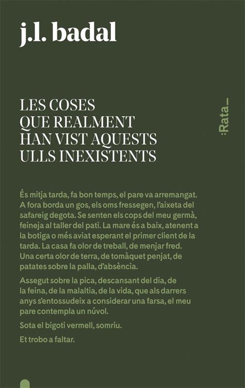 Hi ha una nit immensa i sense estructura. Però s'apostrofa amb el nostre cor. És mitja tarda, fa bon temps, el pare va arremangat. A fora borda un gos, els oms fressegen, l'aixeta del safareig degota. Se senten els cops del meu germà, feineja al taller del pati. La mare és a baix, atenent la botiga o més aviat esperant el primer client de la tarda. La casa fa olor de treball, de menjar fred. Una certa olor de terra, de tomàquet penjat, de patates sobre la palla, d'absència. Assegut sobre la pica, descansant del dia, de la feina, de la malaltia, de la vida, que als darrers anys s'entossudeix a considerar una farsa, el meu pare contempla un núvol. Sota el bigoti vermell, somriu.