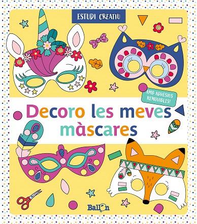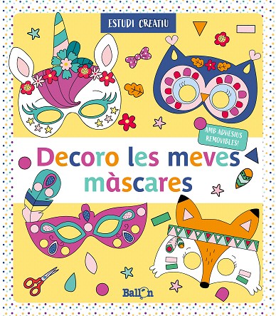 12 màscares per pintar i decorar amb adhesius removibles! En aquesta nova serie, els nens podran pintar les màscares i a continuació decorar-les amb adhesius removibles. A cada pàgina, sota la màscara, hi tenen una presentació amb els adhesius que necessiten. Poden observar el model i seguir la proposta de colors. Després de retallar i fer els forats indicats, ja es podran posar les màscares amb una goma elàstica.