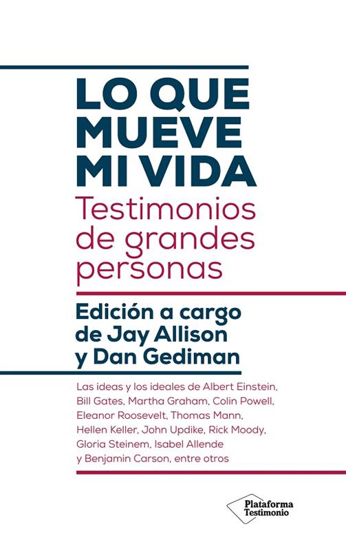 Personalidades como Albert Einstein, Bill Gates, Martha Graham, Colin Powell, Eleanor Roosevelt, Thomas Mann, Hellen Keller, John Updike, Rick Moody, Gloria Steinem, Isabel Allende… son algunos testimonios de Lo que mueve mi vida, una obra que supera las brechas culturales y sociales, un viaje conmovedor y provocativo que nos revelará la profundidad y la sencillez de personas con insuperable grandeza.