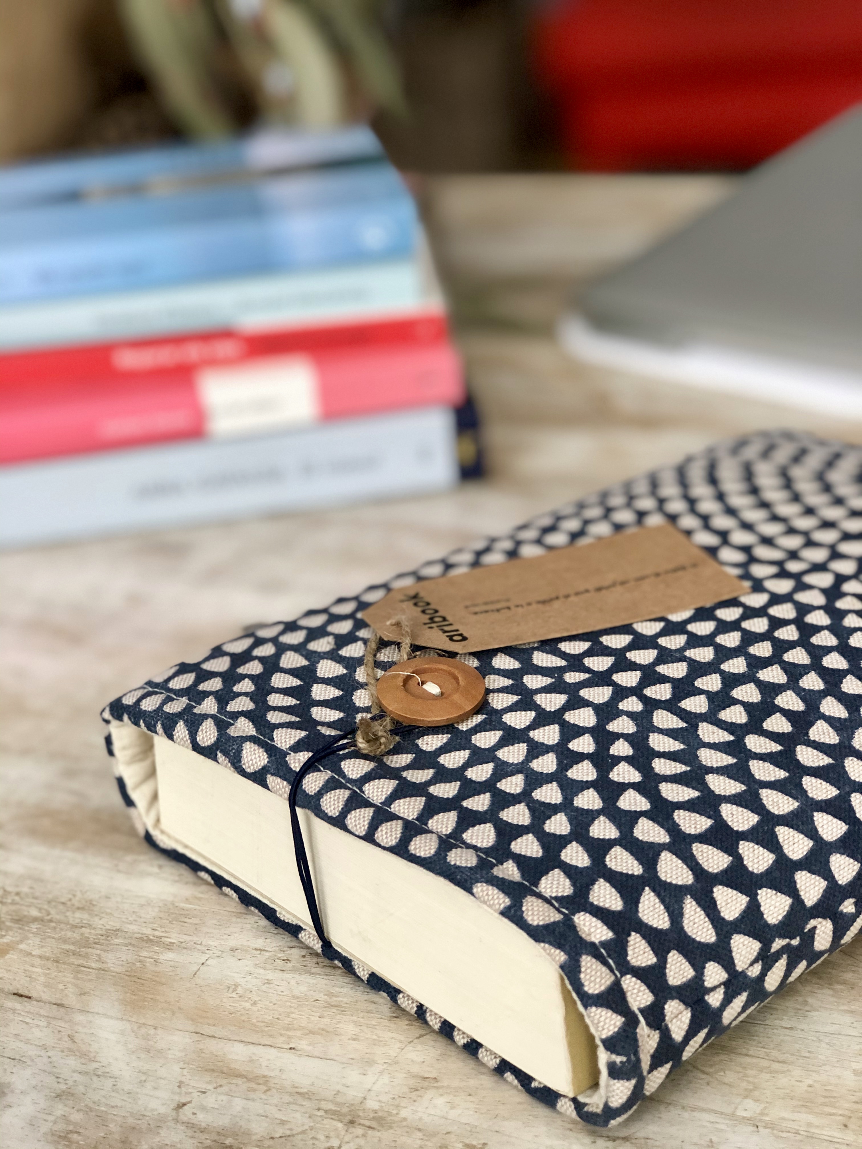 Funda de libro hecha a mano por Aribook. Tela de algodón, acolchada con foam para una máxima protección, cierre elástico con botón y forro interior.