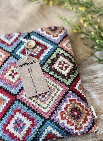Funda de libro hecha a mano por Aribook. Tela de algodón, acolchada con foam para una máxima protección, cierre elástico con botón y forro interior.