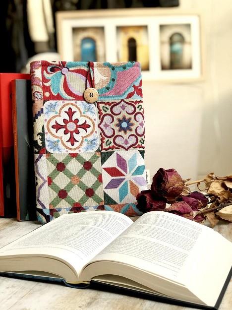 Funda de libro hecha a mano por Aribook. Tela de algodón, acolchada con foam para una máxima protección, cierre elástico con botón y forro interior.