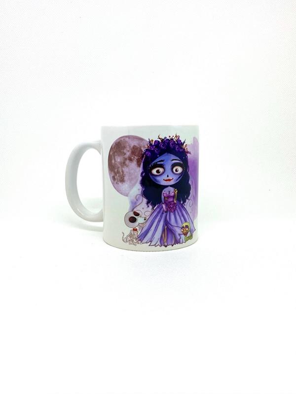 Taza de porcelana con la imagen de La Novia Cadáver. La imagen rodea toda la taza.El tamaño de la taza es estándard, 9,5 x 8cm.Es resistente al microondas y se puede lavar en el lavavajillas.