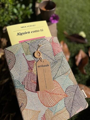 Funda de libro hecha a mano por Aribook. Tela de algodón, acolchada con foam para una máxima protección, cierre elástico con botón y forro interior.