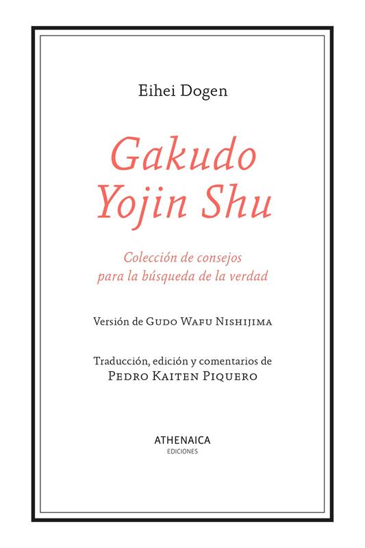 El Gakudo Yojin Shu (Colección de consejos para la búsqueda de la verdad), ofrecido aquí en la versión de Gudo Wafu Nishijima, es una breve recopilación de diez textos con consejos para acercarse al budismo. Basándose en su propia experiencia en la búsqueda de la verdad, y con el fin de ayudar a las personas que quisieran aprenderla, el Maestro Dogen escribió esta guía simple y directa reparando en los aspectos fundamentales a la hora de seguir la vía budista: desde la voluntad para la verdad, las auténticas enseñanzas o qué debemos esperar de la práctica, a la búsqueda de un verdadero maestro o la importancia de sentarse en zazen. Al texto original de Eihei Dogen se suman en esta edición los extraordinarios comentarios del maestro zen Kaiten Piquero que, de forma coloquial, es decir, priorizando la claridad e incorporando ejemplos sencillos, pero al mismo tiempo profundizando al detalle en cada uno de los consejos, toma como referencia el libro original para conformar una guía introductoria contemporánea que expone las bases del budismo zen y cómo acercarse a él. Por ello, el libro admite varios niveles de lectura, intentando servir tanto a los que deseen iniciarse o conocer las bases del budismo como a aquellos que quieran ahondar en su enseñanza.