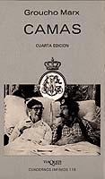 En un memorable día de otoño de 1929, mientras banqueros y millonarios arruinados se tiraban por las ventanas de sus rascacielos, Groucho Marx puso punto final a este libro suyo. Inexplicablemente, una vez agotado, estuvo 46 años sin reeditarse. Al cumplir 85 años, Groucho dio una gran fiesta durante la cual se dejó fotografiar en su lecho para celebrar también la reaparición de Camas. Y es que, para Groucho, la cama siempre fue muy importante, hasta el punto de declararse un «monocamero» acérrimo, o sea fiel a un solo catre. Y en cuanto pudo llevar una vida más o menos sedentaria , convirtió su dormitorio en un auténtico santuario, y su cama, en altar. Su experiencia camera no podía dejar de plasmarse en un pequeño tratado para aficionados y entendidos, que les indicará cuáles son las ventajas de dormir solo, cómo evitar que otro individuo ocupe la propia cama, qué actividades pueden desarrollarse en esta pieza de mobiliario, qué pasó con algunas camas célebres, el origen de la palabra «cama» y en fin, todo lo que querían saber sobre la cama y no se atrevían a preguntar.