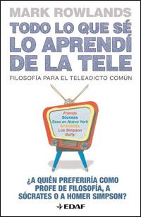 Todo lo que sé lo aprendí de la tele se sirve de nuestras series favoritas de televisión para explicarnos cómo afectan a nuestras vidas las grandes cuestiones filosóficas. Las únicas calificaciones que se exigen para entroncar con esa idea son un sofá, sentido del humor y una mente inquieta. ¿Cómo definiría en qué consiste eso del buen vivir? Homer Simpson y familia no son capaces de ponerse de acuerdo con la forma de vida propuesta por Nietzsche y Epicuro, por mencionar dos formas de pensar totalmente opuestas. ¿Qué significa asumir responsabilidades? Buffy pone en un compromiso a David Hume y a Jean-Paul Sartre. ¿Dónde acaba el amor y empieza la amistad? Platón, Aristóteles y Schopenhauer tratan de que Rachel y Ross, garcias a Friends, sean mejores amantes. Respuesta para estas y otras inquietantes cuestiones que nos plantea la vida, gracias a la ayuda de Tony Soprano, Carrie Bradshaw, de Sexo en Nueva York; Niles y Frasier Crane, jack Bauer, el de 24 y Jerry Seinfeld.