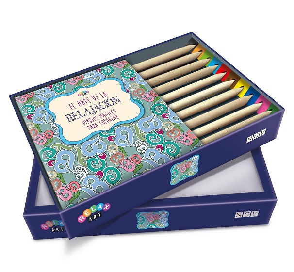 - Bonita caja con un libro de ilustraciones y diez lápices de colores triangulares y ergonómicos