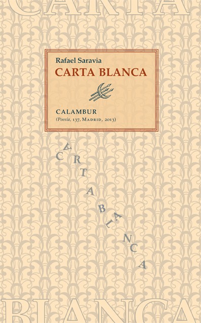 En Carta blanca, su cuarto libro, Rafael Saravia sigue y ensancha el camino que expone su intemperie afectiva en busca de las señales de la conciencia. Un itinerario que se inicia en la autointerrogación, intelectual y corpórea «La genética nos conduce al hombre que conversaba con la tierra […] esa que concierne al agricultor de esperanzas», continúa con el cuestionamiento de los vínculos amorosos «Sólo como presa soy consciente de ti», y finalmente vuelca su mirada sobre el mundo, en su calidad civil «Los herederos del juego quieren vender piolets / a los lectores del Manifiesto por un arte revolucionario independiente / y la nieve ya no limpia los fracasos cosidos al pulóver de los embargados». En palabras de Víktor Gómez, «Lo genético es desbordado por la intensidad de la experiencia vital y la toma de conciencia frente al otro, sea amante, sea pueblo, sea un tiempo herido por sanar y resarcir».