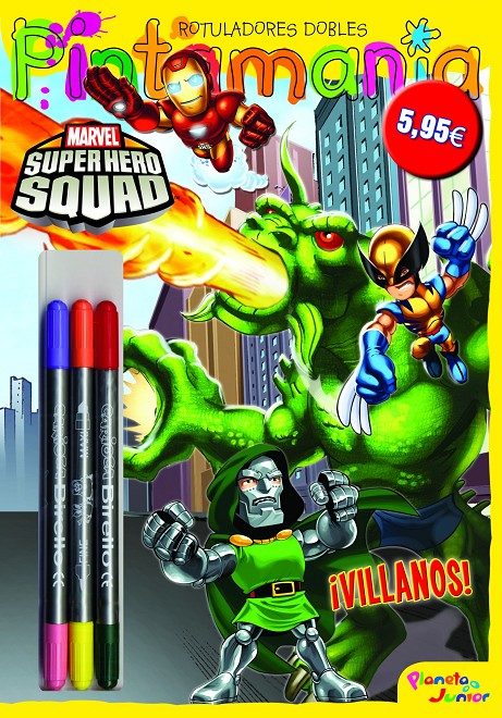 ¿Quiénes son los enemigos de los Super Hero Squad? ¿Quieres conocer a los villanos que no paran de hacerles la vida imposible? Dr. Muerte, Enchantress, Loki, Octopus y muchos más están esperando que los colorees con estos sorprendentes rotuladores de doble punta: ¡en sólo tres rotuladores tienes seis colores!