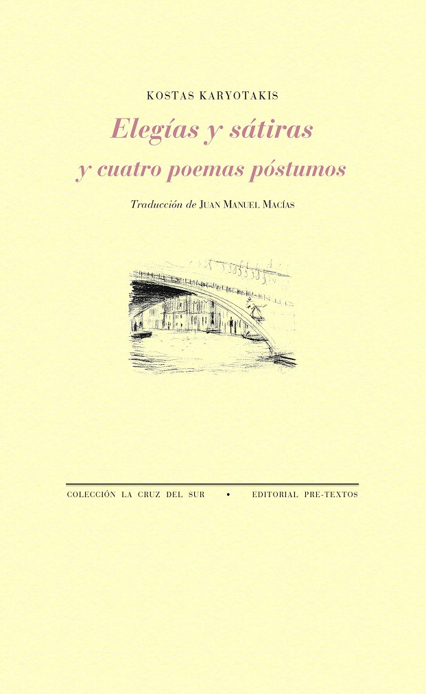 Elegías y sátiras se presenta en este volumen, por primera vez íntegramente en castellano, en la traducción de Juan Manuel Macías, poeta, filólogo y traductor, entre otros, de Cavafis, María Polydouri (Premio de la Sociedad Griega de Traductores 2013) y Safo. Como colofón, se incluyen también los cuatro poemas publicados en revistas tras el fallecimiento del poeta.