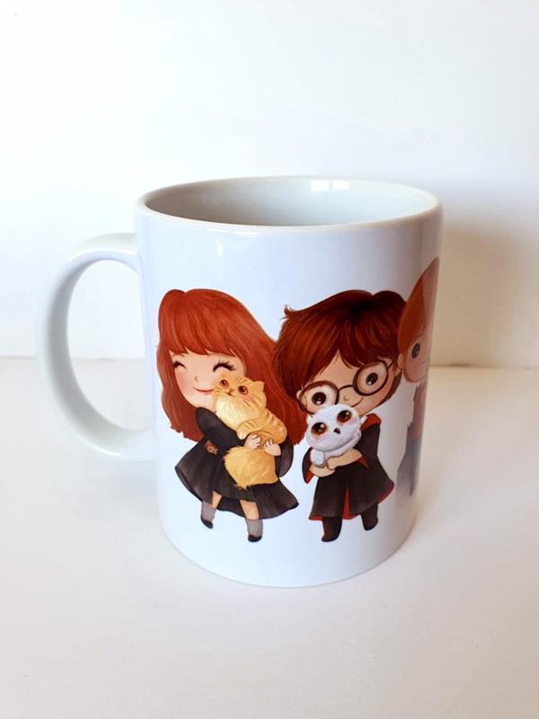 Taza de porcelana con la imagen de Harry Potter. La imagen rodea toda la taza.