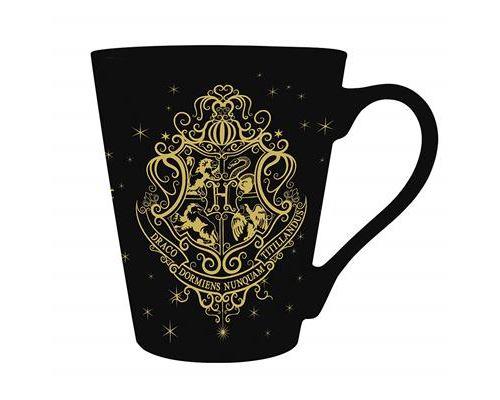 Llamativa taza con fénix y emblema de Hogwarts dibujado en oro sobre fondo negro.