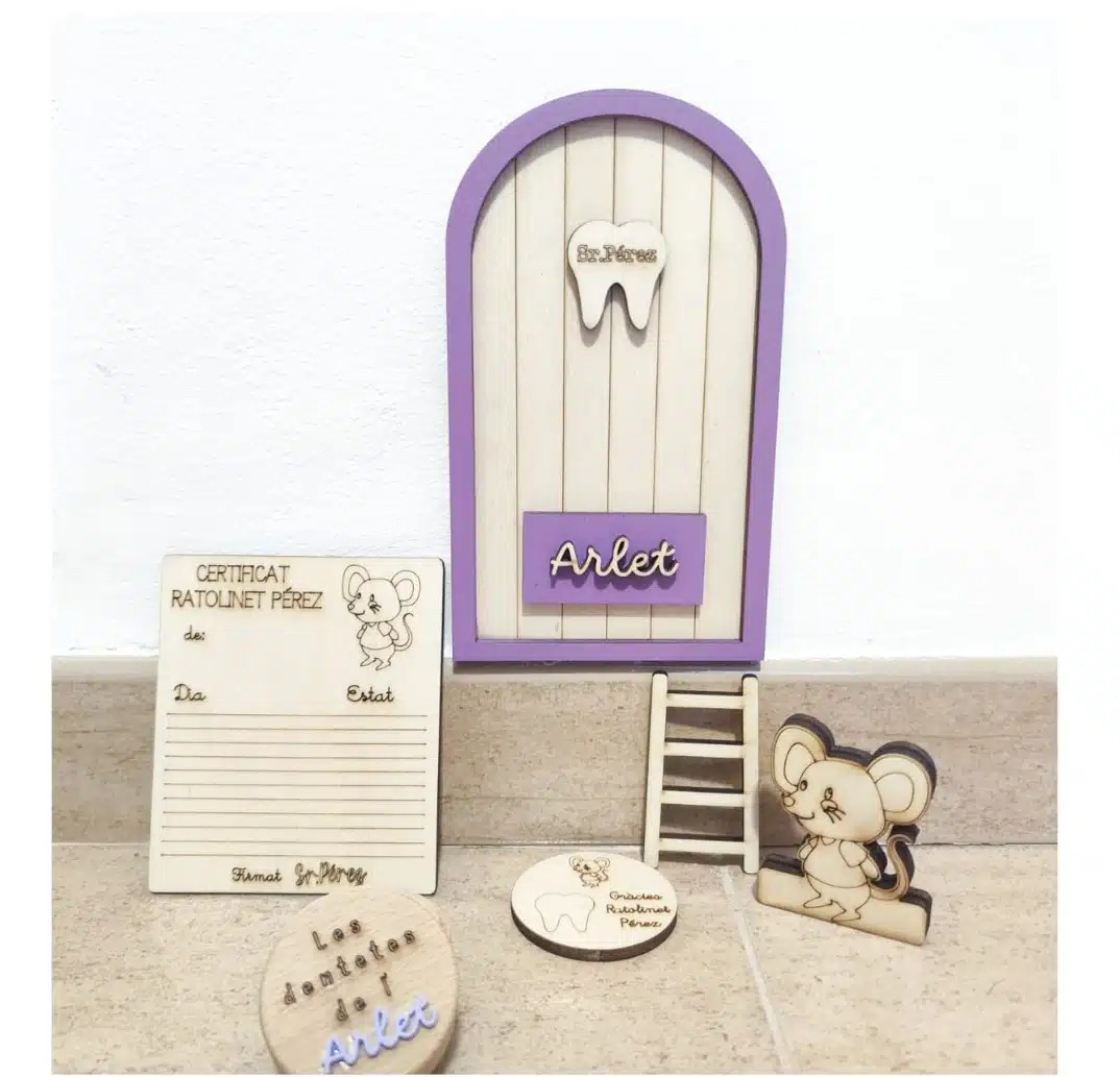 Inclou: porta personalitzada, escala, tapet de fusta on posar la dent, ratolí (ho poden pintar i es manté dret!) i certificat de fusta perquè el ratolí anoti el dia que ha caigut i l'estat en què es troba.