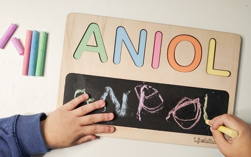 No és només un puzle personalitzat amb el nom, sinó que:– Lletres de metacrilat en colors pastís, per identificar els colors (Quina lletra és la de color blau?) .– Amb pissarra, perquè aprenguin a escriure el seu nom, ja sigui amb un guix d'un sol color, o cadascun amb el color.– Si tens taula de ll...